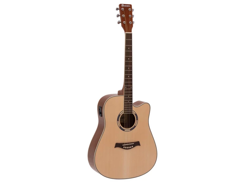 Cutaway formájú western gitár, mahagóni testtel, 21 bundos rózsafa fogólappal, natúr színben.