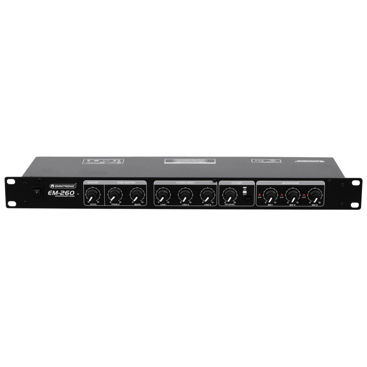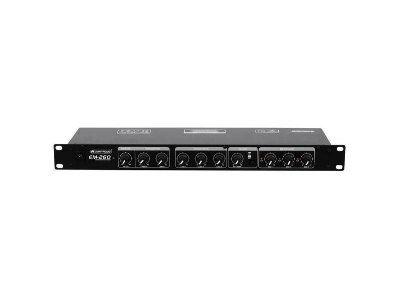 Mixer for microphone and line sourcesThe perfect tool for your karaoke party: With the Omnitronic EM-260B Entertainment Mixer you mix 3 microphone and 3 line sources to one stereo output - in an very simple way. Installing the mixer is easy as well, thanks to the small dimensions you are flexible.Design clearly arrangedEven if you are a beginner, you can operate the mixer very easily. As it is clearly structured, you won't get lost. Each channel has a clip LED. The microphone inputs show optional 12 V phantom power. The unit is perfectly suited for bar, restaurant or club house installation.Effects an recording sessionsWith the FX send/return (with FX level control) you can cut in effects to support your voice. Record singing sessions by using the record output.