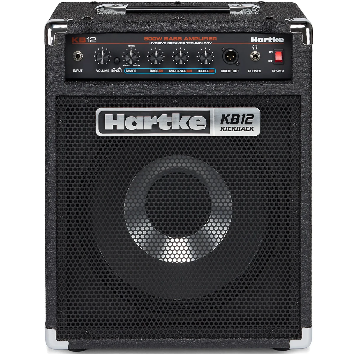 A Kickback KB12 egy 500 wattos, nagy hatékonyságú D osztályú erősítővel és egy 12 hüvelykes neodímium mágneses Hydrive sorozatú hangszóróval rendelkezik. A Hartke Hydrive egyedülálló hibrid kúpos hangszórója egy külső papír kúppal rendelkezik, amely mély és meleg alacsony frekvenciákat produkál, valamint egy belső alumínium kúppal, amely éles, de mégis kellemes középső frekvenciákat produkál. A speciálisan tervezett hangszóródoboz laposan a padlón vagy „kickback” pozícióban is használható, ami növeli a magas frekvenciák tisztaságát és irányultságát. Az erősítő kialakítása és a neodímium hangszórómágnesek hatalmas teljesítményt és könnyű szerkezetet biztosítanak.
