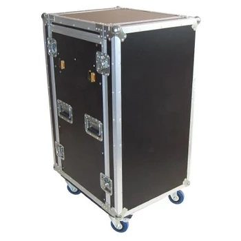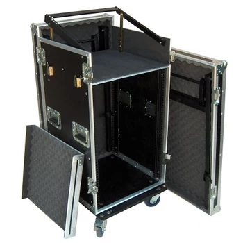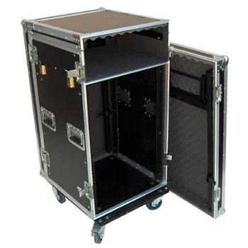 Robust CR sorozatú DJ rack, munkaasztallal 12+4U magas, 500 mm mély, 9.5 mm vastag rétegelt falemezből.