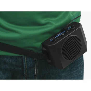 Extrém-kompakt méretű, elemes (AA), 5 Watt teljesítményű, övre csatolható aktív hangfal, fejmikrofonnal.