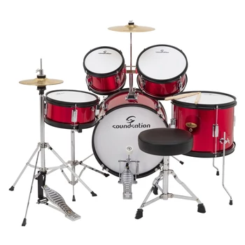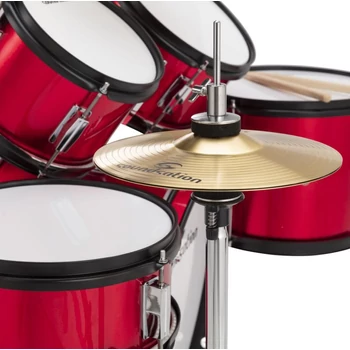 5-részes dobszett gyermekeknek, fóliázott nyárfa testtel, 1db lábdob, 3db tam, 1db pergő, 2db cin, hardverrel, tartozék dobszékkel és 1 pár dobverővel, vörös színben.