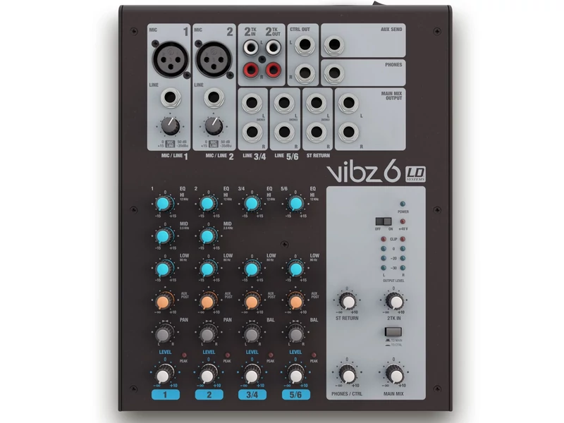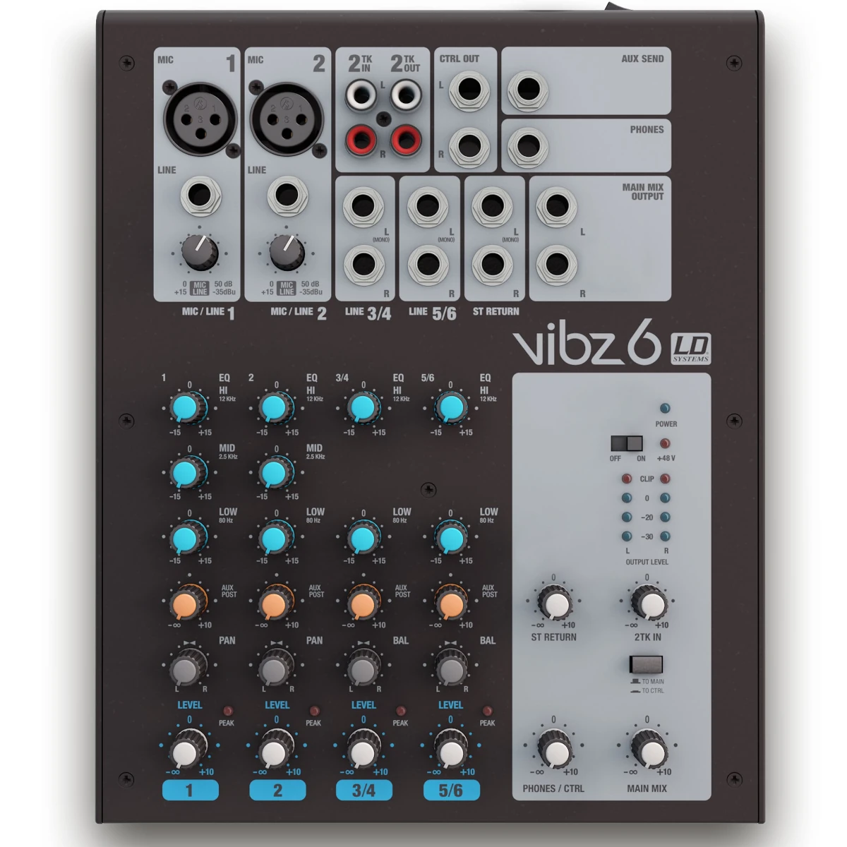 A VIBZ 6 kompakt hatcsatornás keverő tökéletesen megfelel a szórakoztató műfajban, kisebb zenekaroknak, házi felvételhez és installációhoz. Két szimmetrikus mikrofonbemenettel, kiváló előerősítőkkel, fantomtáppal, háromsávos EQ-val (+/-15 dB-es állítási lehetőséggel), két sztereó (monó kompatibilis) vonalbemenettel és azokon kétsávos EQ-val rendelkezik.