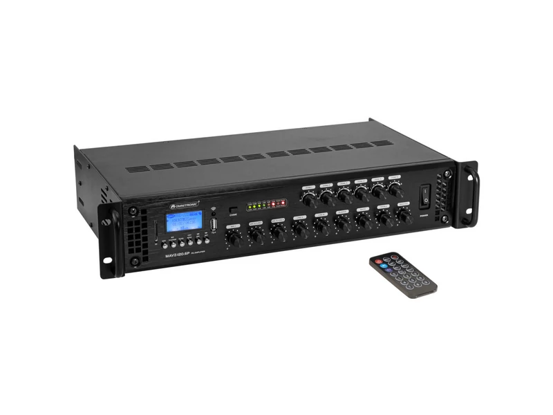 6-zone PA mono mixing amp, MP3 player & IR remote, zones switchable, 120 W