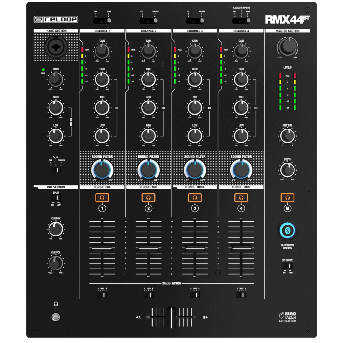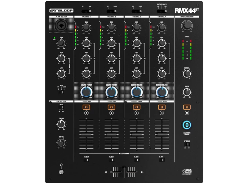 A 9 bemenettel és 4 kimenettel, valamint csatornánként 3 sávos EQ-val és bipoláris szűrőegységgel (bipolar filter) az RMX-44 BT nem csak egy teljes értékű DJ keverő, de a Bluetooth kompatibilitásnak és a 2 sávos EQ mikrofon szekciónak köszönhetően “talk-over” funkcióval ideális bárok, mobil DJ-k és otthoni felhasználásra is.